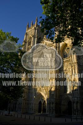 The front of the incredible and majestic York Minster bathed in evening sunlight