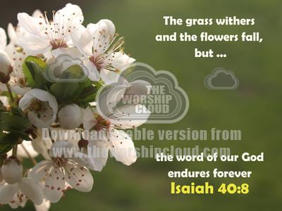 Spring blossom against a green background with the words of scripture from Isaiah 40:8