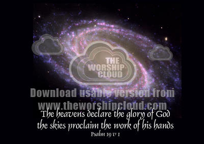 Text Psalm 19 'The heavens declare the glory of God; the skies proclaim the work of his hands.' set against background NASA cosmos universe creation environment stewardship.