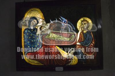 The Nativity in stained glass Inside the modern concrete underground Basilica of St-Pie X, Lourdes, France