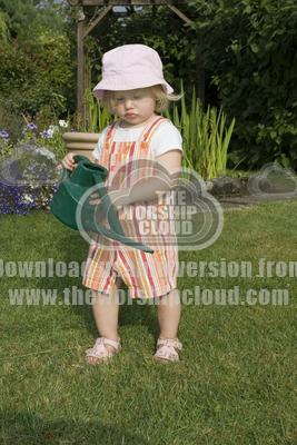 • Toddler in striped overalls watering flowers in gardenl, Woodman