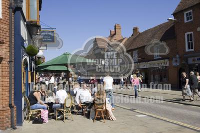 Tourists relaxing outside cafe Stratford-upon-Avon, Warwickshire, UK