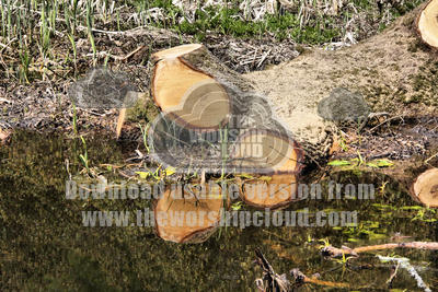 A tree trunk that's fallen into water, with branches sawn off, with a good reflection