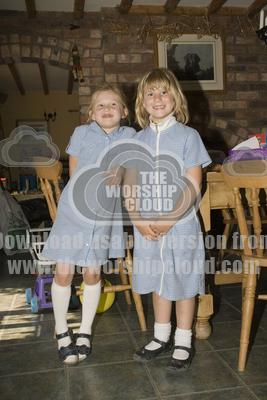 Two young primary 6 year old school children at home in school uniforms, Mickleton, Cotswolds, UK