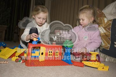 Two young girls playing with Duplo building blocks UK