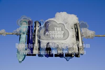 Washing line pegs shining in the winter sun and covered in snow means no washing today