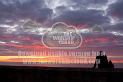 Silhouette of adult watching the sun set over a calm ocean.