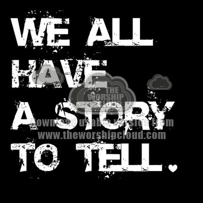 Photoshop design of white text on black background. Statement reads 'we all have a story to tell'. heart shaped full stop.