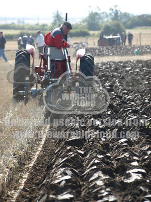 A vintage tractor ploughs the fields exposing the dark brown earth beneath the stubble.