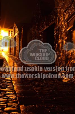 Stone houses and a cobbled street at night after rainfall.