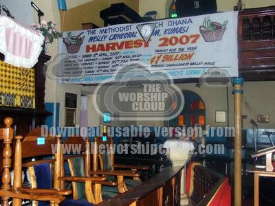 'What shall I render to my God for all his mercy's store': A slogan derived from the hymn of that title as the Harvest banner in Kumasi Wesley Cathedral appealing for 1 billion cedis, approximately £55,000 sterling.