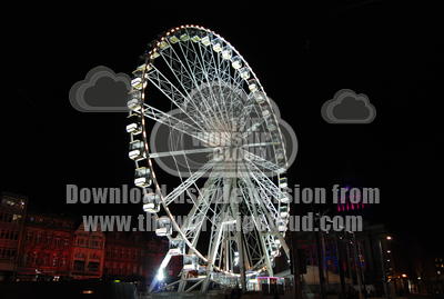 The ferris wheel visits Nottingham's town centre every winter. In the background is the Town Hall, with its clock tower lit up. As part of a winter festival, lights brigthen up the city over a number of chilly evenings bringing light to an otherwise dark time of year.