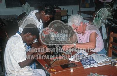 • Woman aid worker teaching African woman sewing WURCS Project Mon