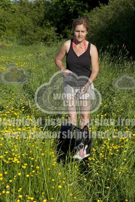 home | resources | woman walking border collie dogs on lead across field of butterc