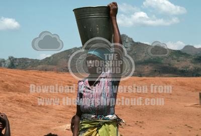 • Woman carrying water bucket on head, Malawi