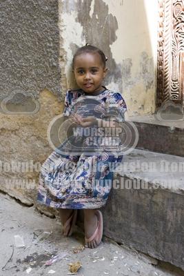 Young Swahili girl sitting in narrow street in Old Town Mombasa, Kenya