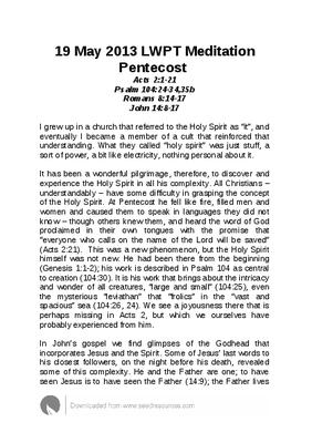 It has been a wonderful pilgrimage, therefore, to discover and experience the Holy Spirit in all his complexity. All Christians – understandably – have some difficulty in grasping the concept of the Holy Spirit. At Pentecost he fell like fire, filled men and women and caused them to speak in languages they did not know – though others knew them, and heard the word of God proclaimed in their own tongues with the promise that “everyone who calls on the name of the Lord will be saved” (Acts 2:21). This was a new phenomenon, but the Holy Spirit himself was not new. He had been there from the beginning (Genesis 1:1-2); his work is described in Psalm 104 as central to creation (104:30). It is his work that brings about the intricacy and wonder of all creatures, “large and small” (104:25), even the mysterious “leviathan” that “frolics” in the “vast and spacious” sea (104:26, 24). We see a joyousness there that is perhaps missing in Acts 2, but which we ourselves have probably experienced from him...