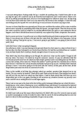 I was just sitting there. Feeling really fed up. I couldn’t do anything else. I hadn’t been able to use my legs for ages. All I could do was to sit. Rejected and neglected. And I wasn’t alone. There were lots of us sitting around that pool. All of us were handicapped or infirm in some way. All day long we’d sit there and watch the water as it was stirred by the breeze in the sunlight. I wasn’t the only one feeling sorry for myself. We were all fed up. It was as if none of us knew any hope at all.
