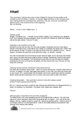 A monologue based on 1 Samuel 25; the story of Abigail and David. Originally written to be included in a Blues Compline, there's ideas for music moods which trace the journey of Abigail's feelings.