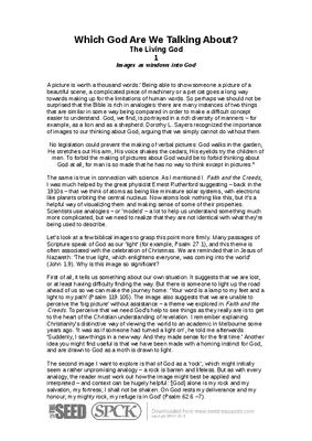 A picture is worth a thousand words.’ Being able to show someone a picture of a beautiful scene, a complicated piece of machinery or a pet cat goes a long way towards making up for the limitations of human words. So perhaps we should not be surprised that the Bible is rich in analogies: there are many instances of two things that are similar in some way being compared in order to make a difficult concept easier to understand. God, we find, is portrayed in a rich diversity of manners – for example, as a lion and as a shepherd. Dorothy L. Sayers recognized the importance of images to our thinking about God, arguing that we simply cannot do without them...