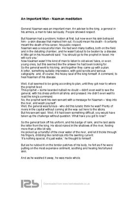 General Naaman was an important man. An adviser to the king, a general in his armies, a man to take seriously. People showed respect. But Naaman had a problem, hidden at first, but now even his skin betrayed him - a skin disease that marked him out. It could mean his death - it certainly meant the death of his career, his public respect.