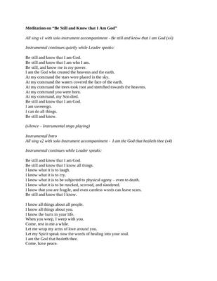 A meditation based on the worship song "Be still and know that I am God". This meditation has been used in various services and places, and has been found to be a highly effective meditation which focusses on Faith, Healing and Trust.