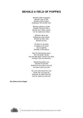 "Behold a field of Poppies", began as a spontaneous song by Audrey Hogan and later turned into a poem by Audrey. It is all about observing the wonders of nature and being moved to praise God for His handiwork.