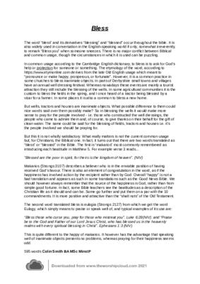 This short (595 words) considers the meaning of "bless" both biblically and in common usage. The practice of blessing inanimate objects is particularly explored.