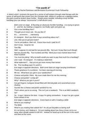 A humorous sketch that can be performed as a dialogue, or broken up into up to 6 parts. Written for youth performers, but could be performed by adults. Aims to contrast the quest for a sense of self-esteem through retails therapy with the sense of self-worth that comes through Christian believing.