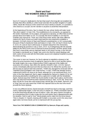 Much of 1 Samuel is dedicated to the fact that Israel’s first king did not establish the dynasty that offers stability to united Israel and later the southern kingdom of Judah; rather, David did. Because of the switch from Saul’s family to David’s, it is possible to view David as a usurper, but the narrator is at pains to avoid that interpretation…