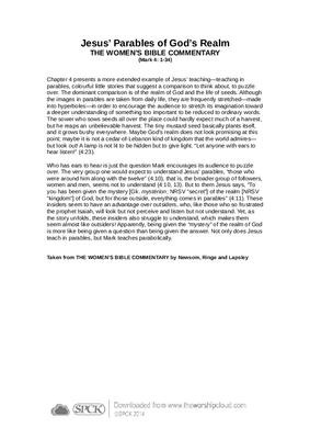 Chapter 4 presents a more extended example of Jesus’ teaching—teaching in parables, colourful little stories that suggest a comparison to think about, to puzzle over. The dominant comparison is of the realm of God and the life of seeds. Although the images in parables are taken from daily life, they are frequently stretched—made into hyperboles—in order to encourage the audience to stretch its imagination toward a deeper understanding of something too important to be reduced to ordinary words…