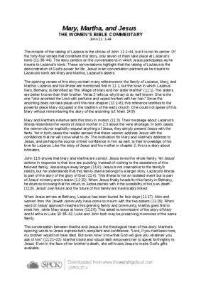 The miracle of the raising of Lazarus is the climax of John 11:1–44, but it is not its center. Of the forty-four verses that constitute this story, only seven of them take place at Lazarus’s tomb (11:38–44). The story centers on the conversations in which Jesus participates as he travels to Lazarus’s tomb. These conversations highlight that the raising of Lazarus is the demonstration of God’s power for life. Jesus’ main conversation partners as he travels to Lazarus’s tomb are Mary and Martha, Lazarus’s sisters…