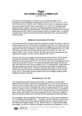 Only shreds of hope appear in this book to counterpoise the deep river of devastation, grief, and despair that pervades most of it (3:14–18; 12:14–17; 16:14–15; 17:24–26; 22:2–4; 23:5–8; 24:4–7; 29:10–14; 42:7–12). In a collection of prose and poetry called “the little book of consolation” (Jer. 30–33), joy overtakes grief, singing replaces weeping…