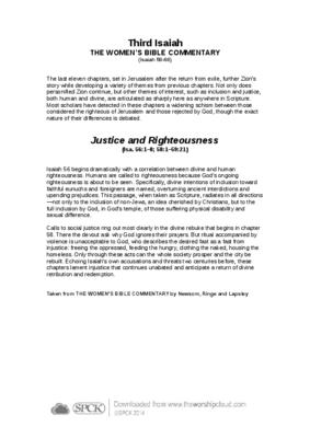 The last eleven chapters, set in Jerusalem after the return from exile, further Zion’s story while developing a variety of themes from previous chapters. Not only does personified Zion continue, but other themes of interest, such as inclusion and justice, both human and divine, are articulated as sharply here as anywhere in Scripture…