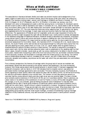 The associations in literature between fertility and water are ancient intuitive acknowledgments of our watery origins on earth and in our mothers’ wombs, and of the source of life upon which we continue to depend. Four scenes involving water, women, and marriage or childbirth are found in Genesis: 16:7–14; 21:8–21 (Hagar); 24:10–27 (Rebekah); and 29:1–12 (Rachel). In the latter two scenes, men from Abraham’s kin come to Mesopotamia to seek a wife from among his kin…