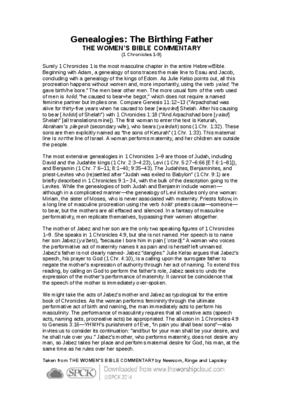 Surely 1 Chronicles 1 is the most masculine chapter in the entire Hebrew Bible. Beginning with Adam, a genealogy of sons traces the male line to Esau and Jacob, concluding with a genealogy of the kings of Edom…