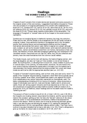 Chapters 8 and 9 consist of ten miracle stories and several controversy accounts. In the original version of this commentary, I suggested that Matthew focused on “those who are outcasts of or marginal participants in the Jewish cultic establishment— lepers (8:1–4), Gentiles (8:5–13), women (8:14–15), demoniacs (8:16, 28–34; 9:32), tax collectors (9:9–13), sinners (9:11–13), the cultically impure (9:20–22), and even the dead (9:23–26).” Recent study requires reformulation of this description. The language of “marginal” or “outcast” does not fit the Gospel or the social context it represents…