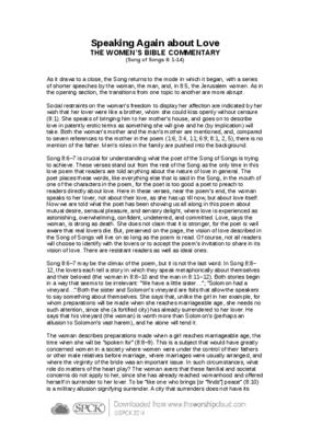 As it draws to a close, the Song returns to the mode in which it began, with a series of shorter speeches by the woman, the man, and, in 8:5, the Jerusalem women. As in the opening section, the transitions from one topic to another are more abrupt…