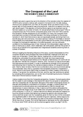 Readers are given a good clue as to the direction of the narrative when the captain of YHWH’s army comes to Joshua with a sword in his hand (5:13). He tells Joshua, “Remove your sandals from your feet, for the place where you stand is holy” (5:15). Moses’ sign of God’s presence was a burning bush; Joshua’s is a captain of an army with drawn sword. This depiction of God the divine warrior is an important one for feminist readers on a number of levels. On whose behalf does God conquer? Who is conquered and why? How are the conquered given voice in the text? Who controls this narrative? Whose perspective is not included? For many, the conquest of the promised land is a story of ultimate liberation, the fitting conclusion to the exodus narrative in which God intervenes to save an oppressed people and bring them to a land flowing with milk and honey. The slave spiritual “Joshua Fit the Battle of Jericho” memorializes this interpretation of the story and evidences the power of this narrative to shape the theological imagination of a suffering people, who are ultimately confident in the liberating power of God. Moreover, this interpretation aligns with the tone of Joshua as a whole, which celebrates with enthusiastic optimism the power of God to act on behalf of the oppressed and marginalized Israelites and bring them to a place of freedom…