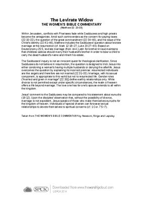 Within Jerusalem, conflicts with Pharisees fade while Sadducees and high priests become the antagonists. Amid such controversies as the concern for paying taxes (22:15–22), the question of the great commandment (22:34–40), and the issue of the Christ’s identity (22:41–46), Matthew includes the Sadducees’ question about levirate marriage at the resurrection (cf. Mark 12:18–27; Luke 20:27–40). Based on Deuteronomy 25:5, levirate marriage (from levir, Latin for brother-in-law) maintains that childless widows should marry their husband’s brother in order to bear a child to carry the dead husband’s name and inherit his estate…