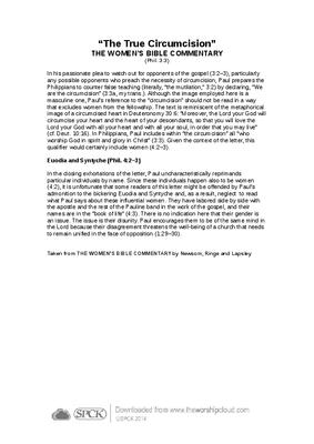 In his passionate plea to watch out for opponents of the gospel (3:2–3), particularly any possible opponents who preach the necessity of circumcision, Paul prepares the Philippians to counter false teaching (literally, “the mutilation,” 3:2) by declaring, “We are the circumcision” (3:3a, my trans.). Although the image employed here is a masculine one, Paul’s reference to the “circumcision” should not be read in a way that excludes women from the fellowship. The text is reminiscent of the metaphorical image of a circumcised heart in Deuteronomy 30:6: “Moreover, the Lord your God will circumcise your heart and the heart of your descendants, so that you will love the Lord your God with all your heart and with all your soul, in order that you may live” (cf. Deut. 10:16). In Philippians, Paul includes within “the circumcision” all “who worship God in spirit and glory in Christ” (3:3). Given the context of the letter, this qualifier would certainly include women (4:2–3)…