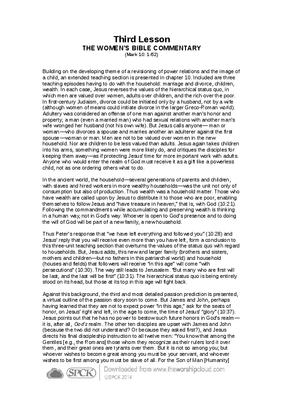 Building on the developing theme of a revisioning of power relations and the image of a child, an extended teaching section is presented in chapter 10. Included are three teaching episodes having to do with the household: marriage and divorce, children, wealth. In each case, Jesus reverses the values of the hierarchical status quo, in which men are valued over women, adults over children, and the rich over the poor. In first-century Judaism, divorce could be initiated only by a husband, not by a wife (although women of means could initiate divorce in the larger Greco-Roman world). Adultery was considered an offense of one man against another man’s honor and property; a man (even a married man) who had sexual relations with another man’s wife wronged her husband (not his own wife). But Jesus calls anyone— man or woman—who divorces a spouse and marries another an adulterer against the first spouse—woman or man. Men are not to be valued over women in the new household. Nor are children to be less valued than adults. Jesus again takes children into his arms, something women were more likely do, and critiques the disciples for keeping them away—as if protecting Jesus’ time for more important work with adults. Anyone who would enter the realm of God must receive it as a gift like a powerless child, not as one ordering others what to do…