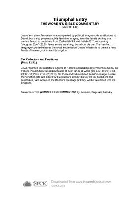 Jesus’ entry into Jerusalem is accompanied by political images such as allusions to David, but it also presents subtle feminine images, from the female donkey that carries Jesus, to quotations from Zechariah 9:9 and Isaiah 62:11 concerning “daughter Zion” (21:5). Jesus enters as a king, but a humble one. The familial language counterbalances the royal acclamation: Jesus’ mission is to create a new family of heaven, not an earthly kingdom….