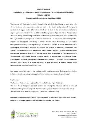 The theme of this thesis is the centrality of relationship to individual well-being; its focus is the help offered to those who experience mental ‘dis-ease’ by the theory and practice of ‘therapeutic Quakerism’. It argues that a different model of care to that of the current biomedical one is required, a model centred on ‘the establishment of loving relationships’ rather than the application of medical theory and knowledge in the treatment of those ‘in mental dis-ease’. The author believes that psychiatric theory and practice continue to be dominated by a dualistic understanding of ‘Be- ing’ (she uses Daly’s (1986) term ‘Be-ing’ to infer the dynamic nature of existence), and turns to the theory of ‘holistic nursing’ for a cogent critique of its failure to consider all aspects of the individual – physiological, psychological, emotional and spiritual – in relation to their wider environment. She supports her contention that the alleviation of mental dis-ease requires a far greater recognition of the key role relationship plays in the healing process with an overview of Christian theological anthropologies, investigating whether religious theories of pastoral care – particularly Quaker pastoral care – offer effective theoretical frameworks for the practice of holistic nursing. The author concludes that a synthesis of these approaches in what she terms a ‘Quaker therapy’ could represent a new paradigm for psychiatric care.