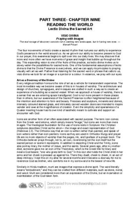 divina is that the Divine Presence is everywhere, and we can apply its principles to praying visually with art as well. Rather than listening for the sacred word or phrase that calls to us, in visio divina we look for an image or a symbol or a colour. In essence, we pray with our eyes…
