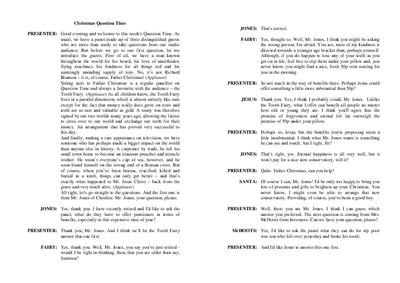 Sketch in the style of Question Time, in which the panel is made up of Jesus, Santa and the Tooth Fairy. They each explain what they have to offer members of the audience. Suitable for Christmas.