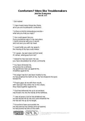 When I take students through the book of Job in classes, I invite them to let me know the questions it raises for them, and usually someone asks, “So when we are ministering to people who are suffering like Job, what do we say to them if we want to avoid the mistakes of Job’s friends?” My response is that the book of Job has no answer to that question, nor is there much of an answer anywhere else in the Bible. That fact has a couple of implications. One is to raise the question of why we think we need to have something to say. The other is that there isn’t much that is useful to say. Words aren’t much use to people when they are going through Job’s experience. A friend of mine who is an alcoholic told me about a woman at an AA meeting who said that she was full of shame from having left her husband for another man and that the best thing anyone ever did for her was to come and stand next to her at an AA meeting—just stand there, nothing else. Sometimes standing next to someone may be the only thing and the best thing to do...