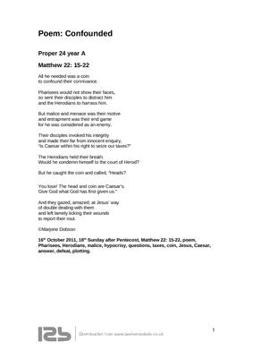 16th October 2011, 18th Sunday after Pentecost, Matthew 22: 15-22, poem, Pharisees, Herodians, malice, hypocrisy, questions, taxes, coin, Jesus, Caesar, answer, defeat, plotting.