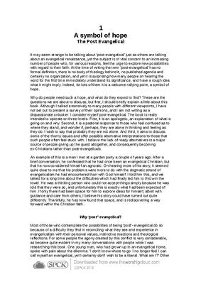It may seem strange to be talking about ‘post-evangelical’ just as others are talking about an evangelical renaissance, yet the subject is of vital concern to an increasing number of people who, for various reasons, feel the urge to explore new possibilities with regard to their faith. At the time of writing the term ‘post-evangelical’ has no formal definition, there is no body of theology behind it, no published agenda and certainly no organization, and yet it is surprising how many people on hearing the word for the first time immediately understand its significance, and have a rough idea what it might imply. Indeed, for lots of them it is a welcome rallying point, a symbol of hope…