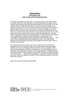 The great commandment is about love: ‘You shall love the Lord your God, with all your heart, with all your soul, with all your mind, and with all your strength.’ We are invited to give ourselves to the God who gives himself to us. As He loves us, we are invited to love Him... What God asks from us in return for all that He gives us is a response of reciprocal love. It is in loving Him that we discover how He first loved us, and how deep His love is. This is not so much a law but an invitation to us, and a delight. If we cannot enjoy time in His presence we have hardly begun to love. If we do not put ourselves out to share with Him, we can hardly say we love Him. Yet once again, even if we do not love Him, He loves us with an everlasting love. I like the words of Teilhard de Chardin concerning adoration: ‘To adore means to lose oneself in the unfathomable, to plunge into the inexhaustible, to find peace in the incorruptible, to be absorbed in defined immensity, to offer oneself to the fire . . . and to give of one’s deepest to that whose depth has no end.’1 At its simplest and deepest it was expressed by a peasant woman before the altar who said, ‘I look at Him and He looks at me.’..